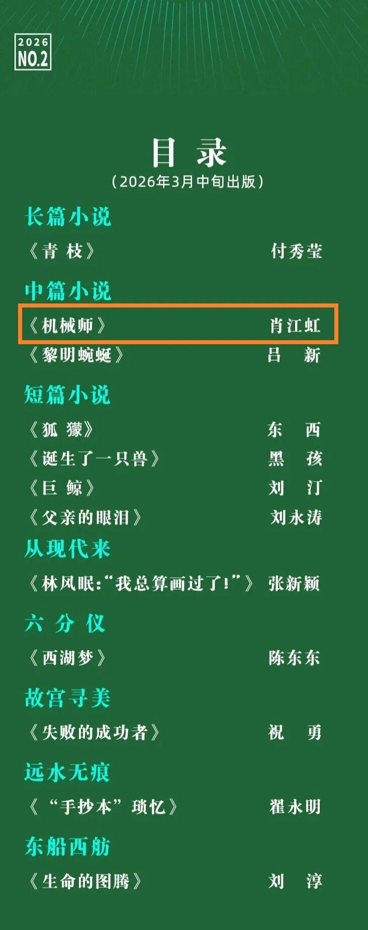 肖江虹最新中篇小说《机械师》登陆《收获》2026年第2期