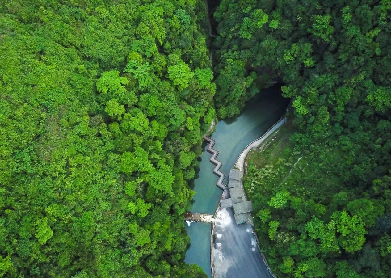 这也是黔北群山最典型的特征,石灰岩断层不时出现,壁立在绿树与群峰中间。还有幽深洞穴,从崖上吐出悬泉,张挂一道飞瀑,把清凉的喧声与雾气散布山间。更有洞隐身于崖脚,从绿树中溢出条清冽水流,萦绕在山间小坝,又从某个落水洞潜回地下。亮光散尽,回声深长。