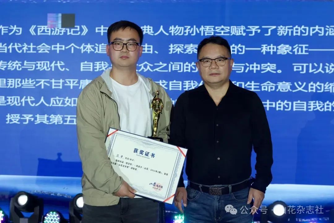 感谢《山花》杂志将这份荣誉授予《致以深切的悼念或大话西游》。作为中国文学界的重要阵地,《山花》始终以敏锐的眼光和开放的胸怀,承载着先锋与传统的对话,见证了一代代写作者的探索与成长。能在《山花》发表作品并获奖,于我而言是一种很大的鼓励。