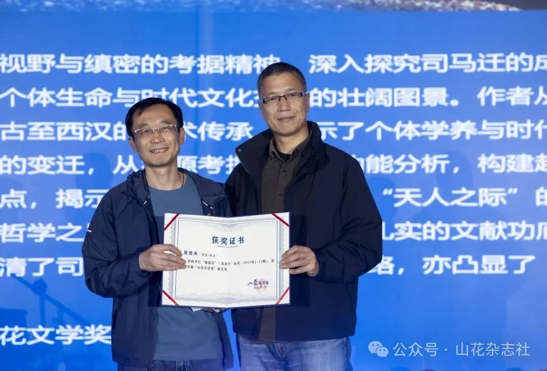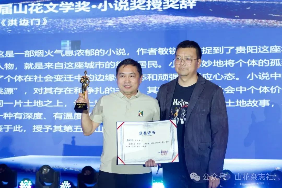 贵州省作协副主席、《山花》主编李寂荡,贵州省作协副主席、贵阳市文联副主席肖江虹等相关领导出席颁奖仪式,黄德海、胡竹峰等10位获奖作家发表了获奖感言。“山花文学奖”的设立,旨在表彰在《山花》刊发的优秀作品,以及在《山花》发表作品的优秀作家。设立以来,在国内文学界引起了强烈反响,一些省区还出台了相应的奖励政策,其当地作家获得“山花文学奖”可获得相应的奖励。“山花文学奖”已举办过四届,2016年的首届“双年奖”仅针对小说,从2018年第二届“双年奖”开始,才正式拓展为综合性文学奖项,涵盖了小说、散文、诗歌、评论等文体,本届文学奖的评选范围是2022年和2023年在《山花》刊发的所有作品。获奖作品中,有捕捉到贵阳这座城市独有韵味的《洪边门》,也有以宏阔的学术视野与缜密的考据精神,深入探究司马迁的成长背景、学术渊源及《史记》的历史影响,呈现了一幅个体生命与时代文化交融的“履霜志”专栏;获奖作家有黄德海、胡竹峰、杨键等实力作家,也有费滢、宁远等新锐小说家,以及戴冰、冉正万等贵州本土优秀作家。风格多样,尤其注重作品的艺术价值。