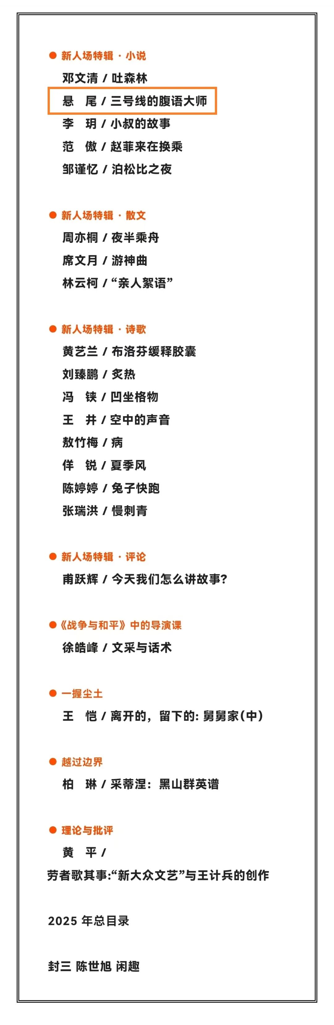 近日,贵州95后作家悬尾的短篇小说《三号线的腹语大师》登上《上海文学》2025年第12期。
