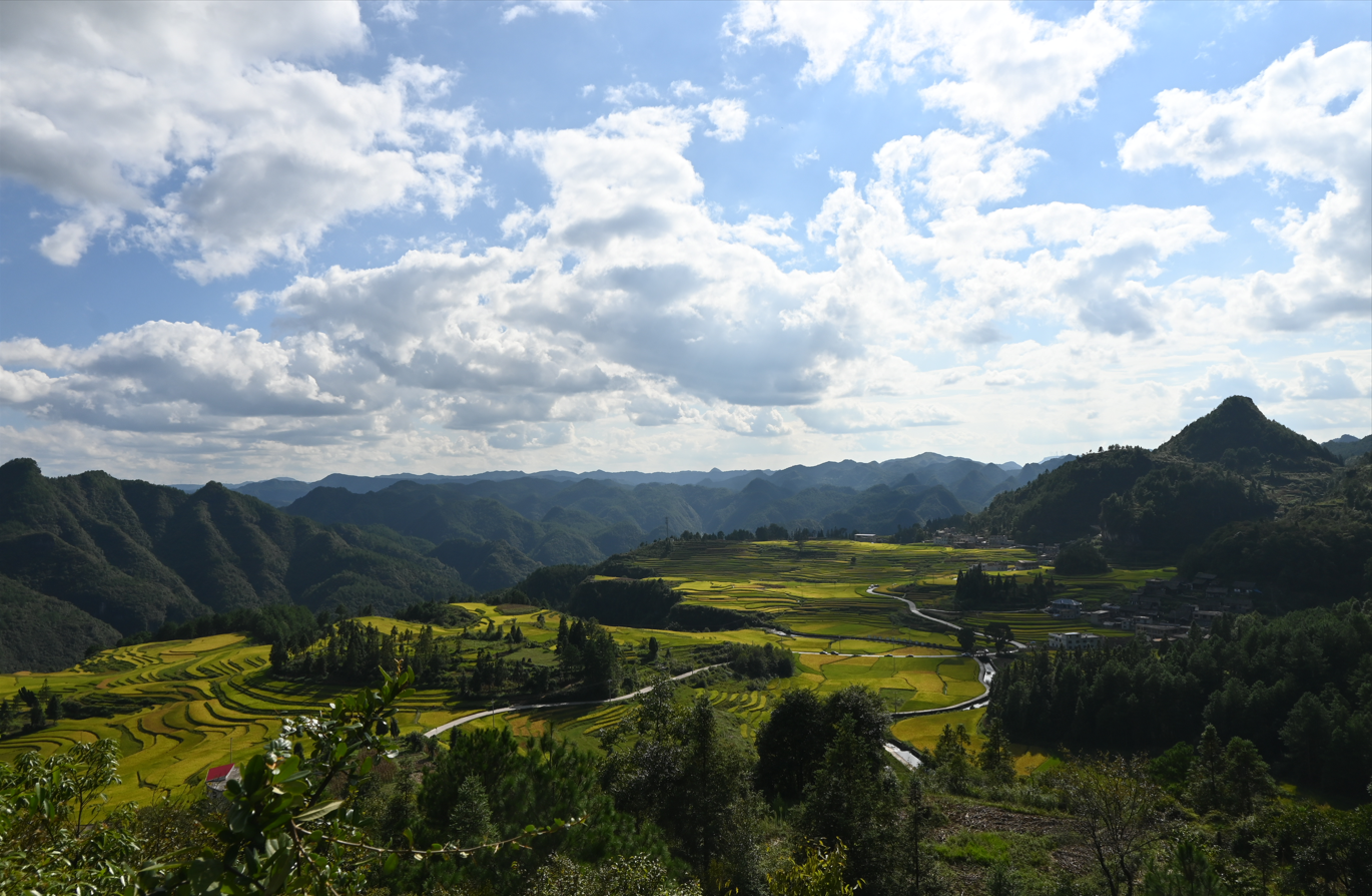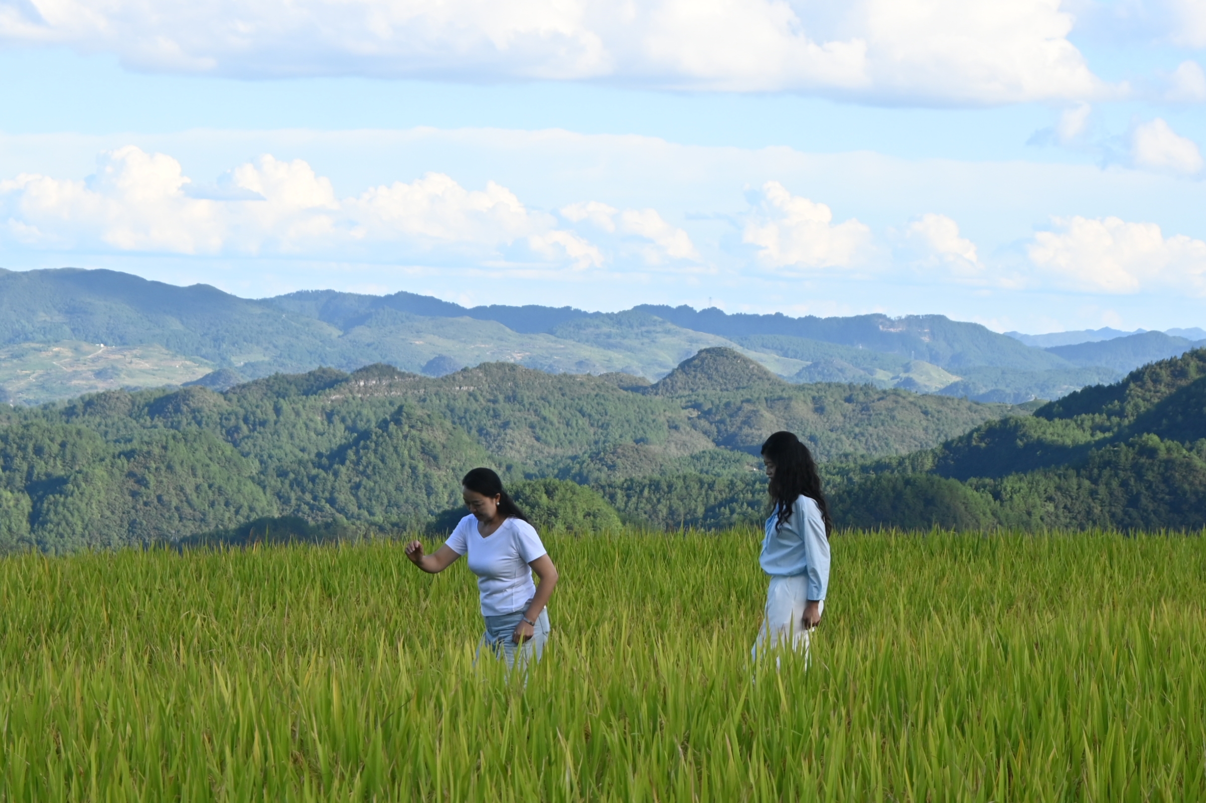 “太治愈了,蓝天、白云、金色的梯田就像在童话里一样。”离开老工厂,作家们辗转来到腊利梯田,金黄的稻穗在阳光下随风摇曳,村民们背着竹筐、扛着镰刀穿梭田间,忙着筹备秋收,一派丰收的喜人景象。